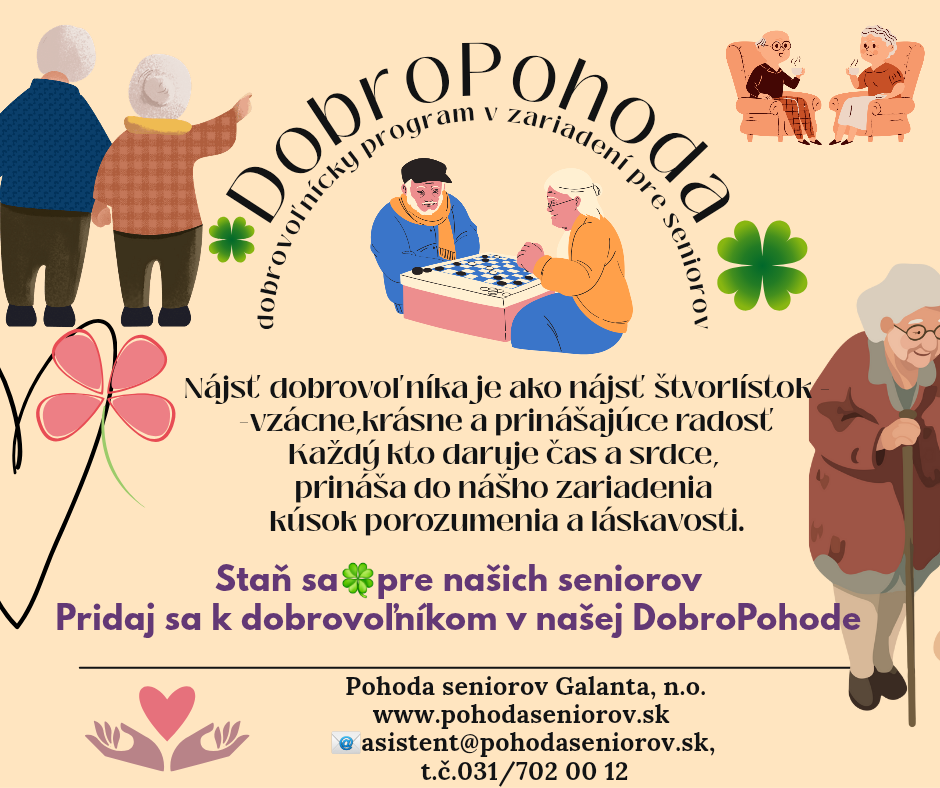 Ak máš chuť zapojiť sa do nášho dobrovoľníckeho programu, byť súčasťou našej komunity a podporiť život seniorov svojou prítomnosťou či tvorivosťou, kontaktuj nás: asistent@pohodaseniorov.sk.